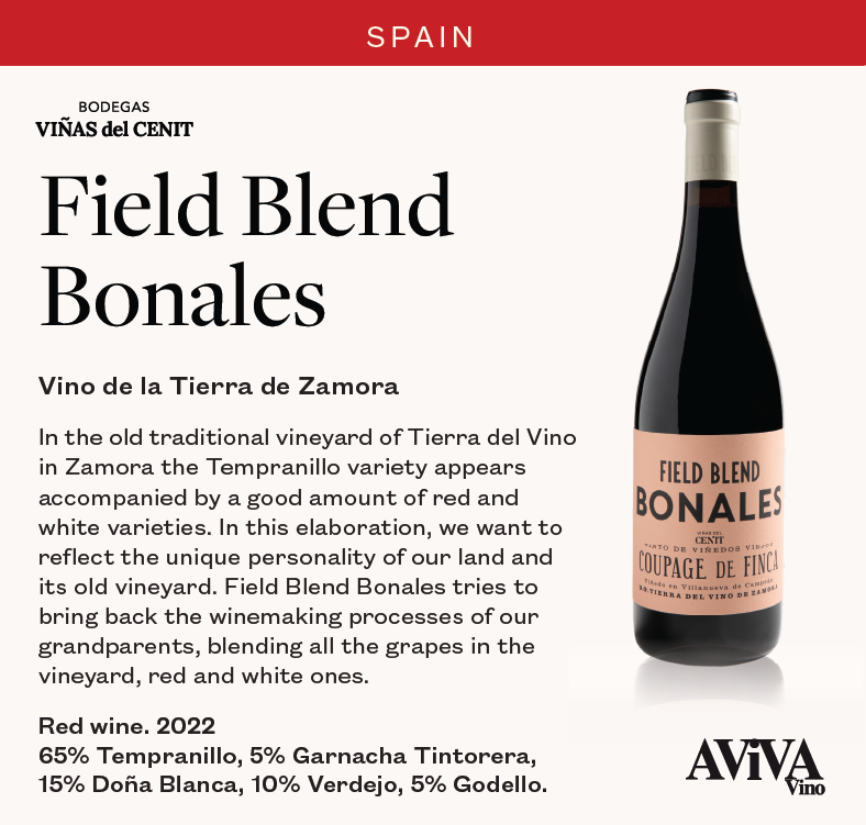 In the old traditional vineyard of Tierra del Vino in Zamora the Tempranillo variety appears accompanied by a good amount of red and white varieties. In this elaboration, we want to reflect the unique personality of our land and its old vineyard. Field Blend Bonales tries to bring back the winemaking processes of our grandparents, blending all the grapes in the vineyard, red and white ones.